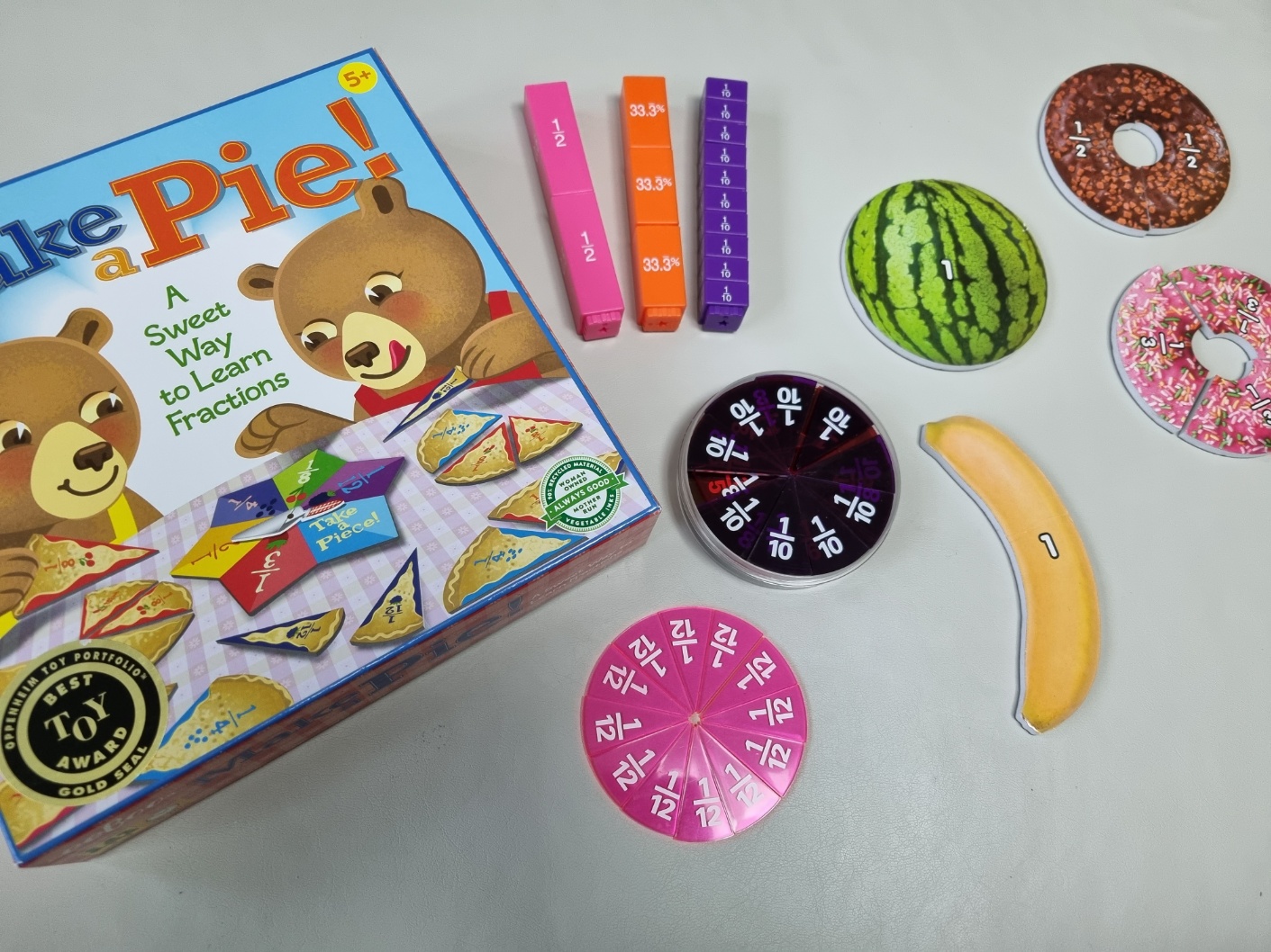 더 좋은 것은 뒷면이 자석이라는 것입니다. 집에 자석칠판이 있다면 붙이면서 만들 수 있습니다. 마감이 훌륭하지 않다거나 프린팅 끝이 벗겨진다거나 하는 이슈가 있습니다만, 직관적으로 재미있게 분수를 접할 수 있는 가격 대비 굉장히 효과 있는 교구라고 생각합니다. 4살 둘째도 아주 좋아하고 어릴 때부터 가볍게 활용해 볼 수 있는 음식 분수입니다.