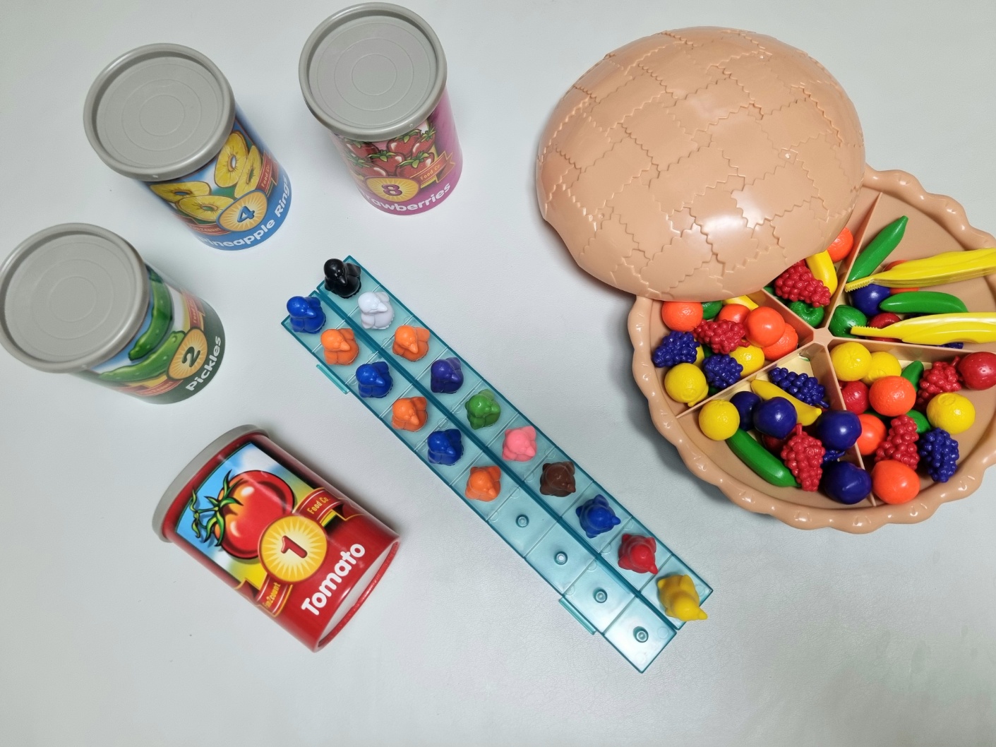 러닝리소스 수세기 통조림(1 to 10 Counting Cans)을 처음 보았을 때는 소꿉놀이 장난감인가 싶었습니다. 그만큼 아이들의 주방에 위치해 있어도 전혀 위화감이 없는 모습입니다. 실제로 토마토, 버섯, 오이, 딸기 등 생활 속에서 자주 볼 수 있는 식재료들이기에 소꿉놀이에 사용해도 손색없는 교구이기도 합니다. 통마다 식재료의 그림과 함께 숫자가 쓰여있습니다. 토마토 통에는 토마토 그림과 함께 1이라고 쓰여 있는데 실제로 뚜껑을 열어보면 토마토 모형이 1개 들어 있는 식입니다. 수를 인지하고 수양일치를 알려주기에 아주 딱 맞는 교구입니다.