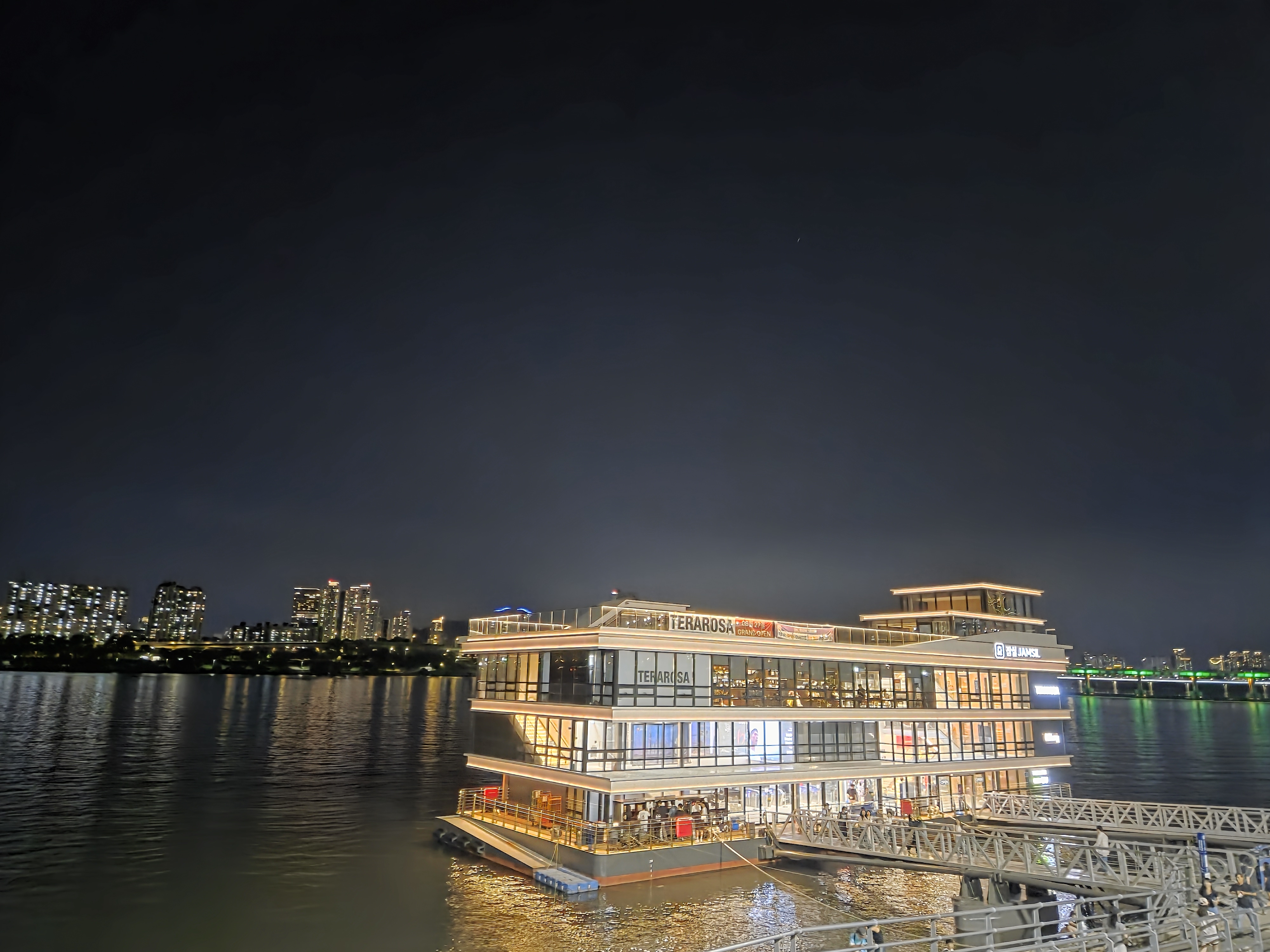 환하게 불을 밝히고 있는 한강버스 선착장의 모습.